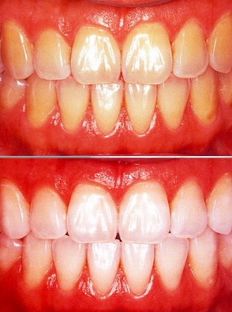 これも、とてもよくある質問で、これから3月の卒業・入学・就職・転勤の時期になるとやはりホワイトニングの需要がふえます。写真では上がホワイトニング前で、下がホワイトニング後です。