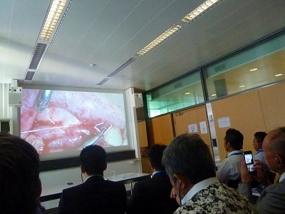 実際の患者様の実際の手術見学がありました。見学と言っても、新しい建物ですから、天井のカメラからの撮影している映像を教室で見る形式のものです。主に口の中だけしか撮影されないので、手術室全体の設備が見えなかったのがちょっと残念です。たぶん、すごい設備なのでしょうね。
