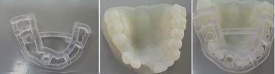 左がドリルのガイド単体・中が3Dプリントした顎の模型・右が模型にガイドを装着した状態です。