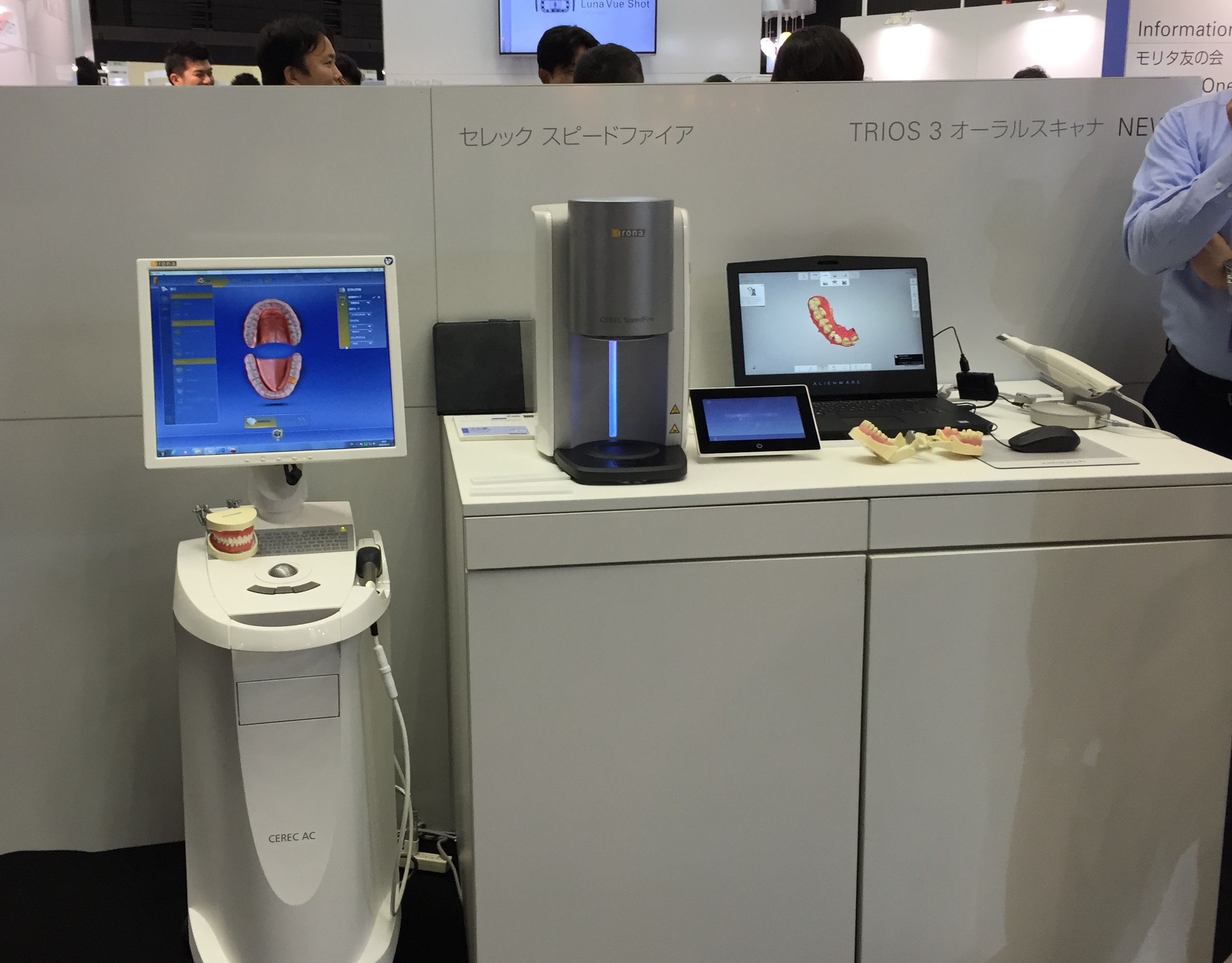 次に、技工士の手間を省くCAD/CAM装置の種類がいくつか新発売されていました。CAD/CAMは、陶器のブロックを削ってセラミックの被せ物を作る機械です。千数百万円以上する機械で、以前はシロックスというメーカーのセレックという1機種だけでしたが、今年は国産も出ていました。今年の保険改正の中に、ハイブリッドセラミックのブリッジも部位限定で可能となりました。また、金属アレルギーがあれば、保険でも奥歯に白いハイブリッドセラミックの被せ物ができるようになっています。いずれも、CAD/CAM装置が必要で、技工士さんの手間を省けるので、今後も普及が予想されます。