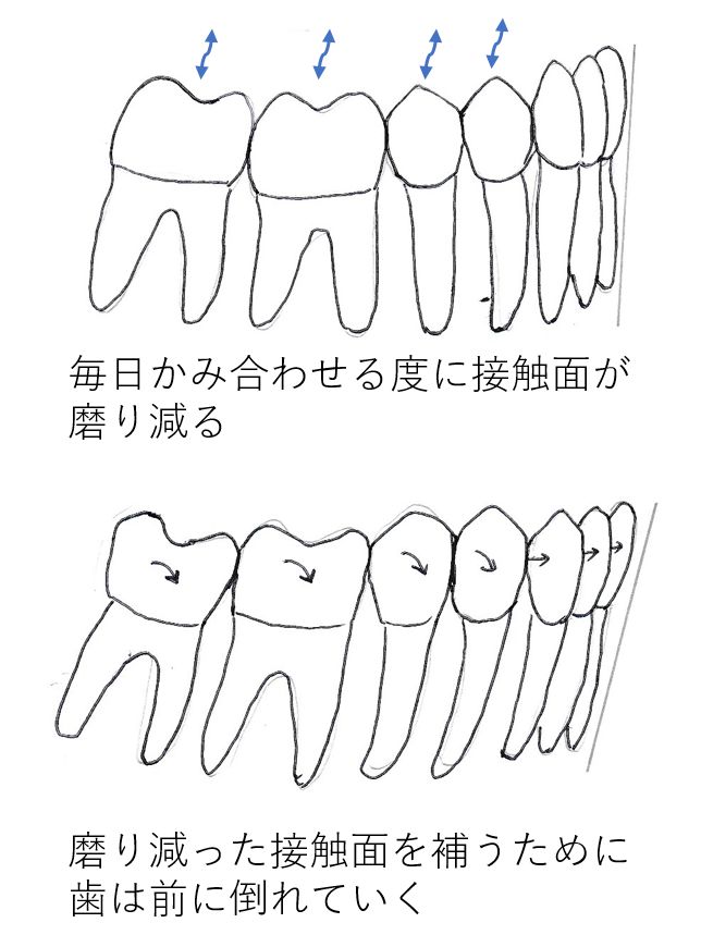 歯が磨り減ると、歯の幅は段々と小さくなっていきます。歯が小さくなって歯が移動しないとすると、当然歯と歯の間に隙間ができてくるはずです。しかし、隙間は実際にはできません。歯は奥歯が段々と前に動くために隙間はできないのです。