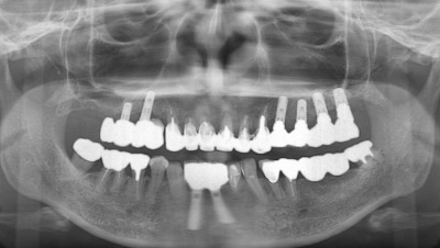 左側上は鼻腔が近くて最初にサイナスリフトをしてその後4本のインプラントを入れました。右側の上はサイナスリフトまではせず、ソケットリフトと歯肉側に少し骨を造るGBRをして2本インプラントにしました。その間に下の前歯にも2本入れて、全体で8本のインプラントとなりました。