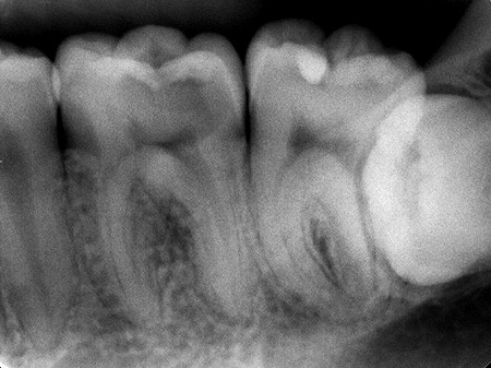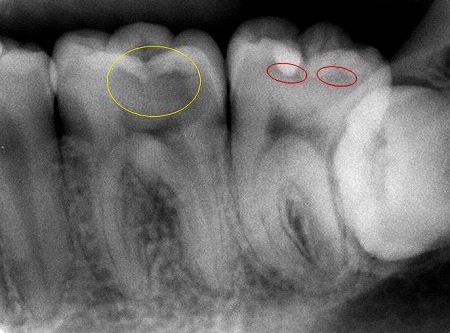 これは、3日程前に来られたある患者様のレントゲン写真です。歯がズキズキするという事で神経を殺す事になってしまいました。原因は下の写真の黄色の丸の部分の虫歯ですが、上から見てもプラスチックが詰めてあるだけで虫歯になっている様子はなかったのです。しかし麻酔してプラスチックを外すとボロボロになつていました。